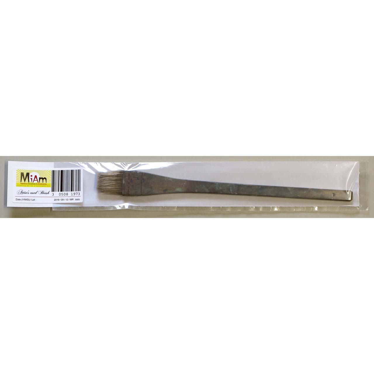 Used brush including traces of old paint (oil and acrylic), wooden handle, string, animal hair.