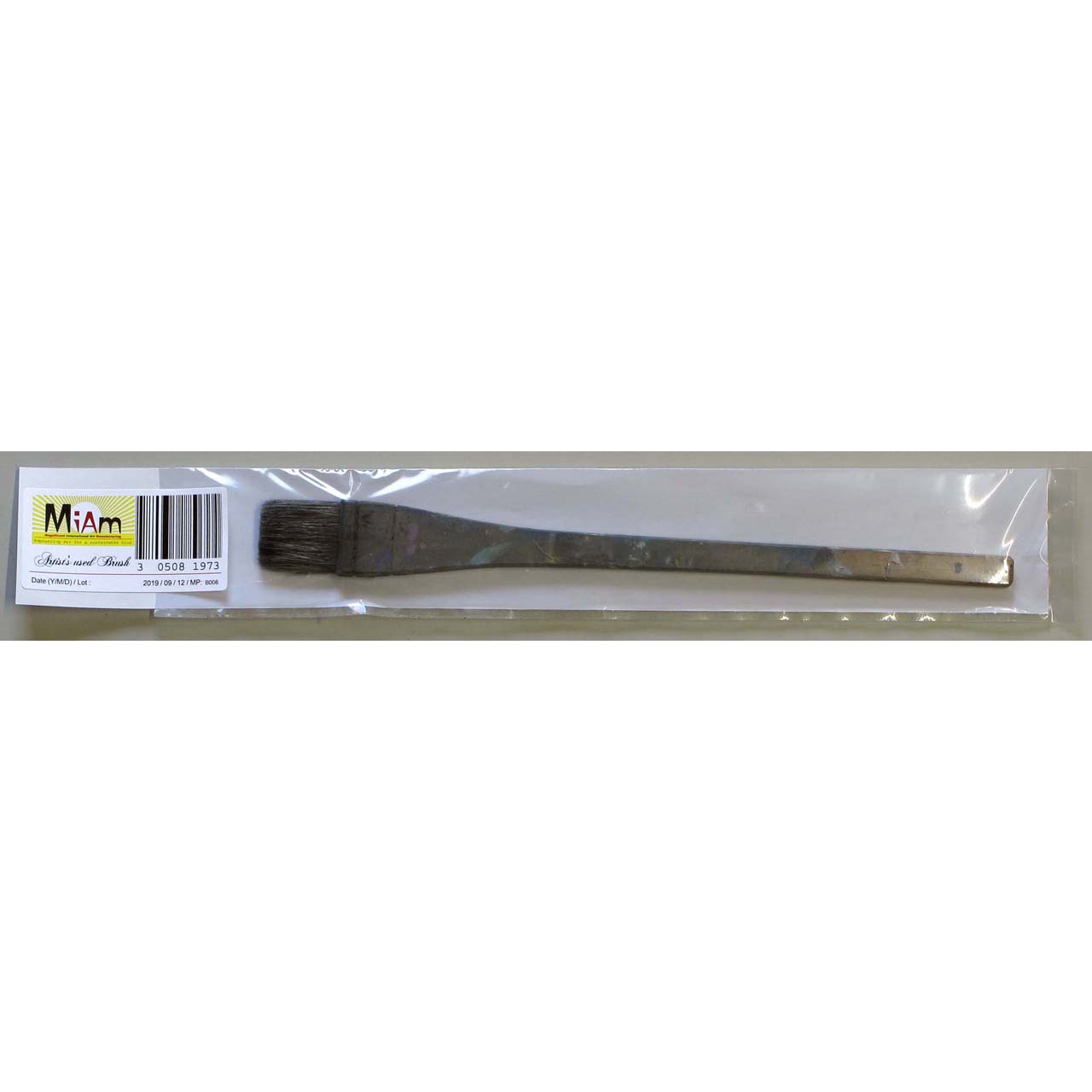 Used brush including traces of old paint (oil and acrylic), wooden handle, string, animal hair.